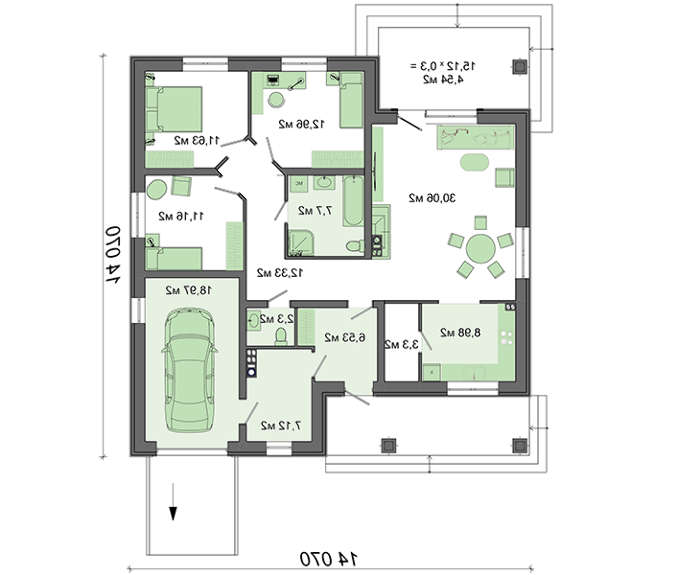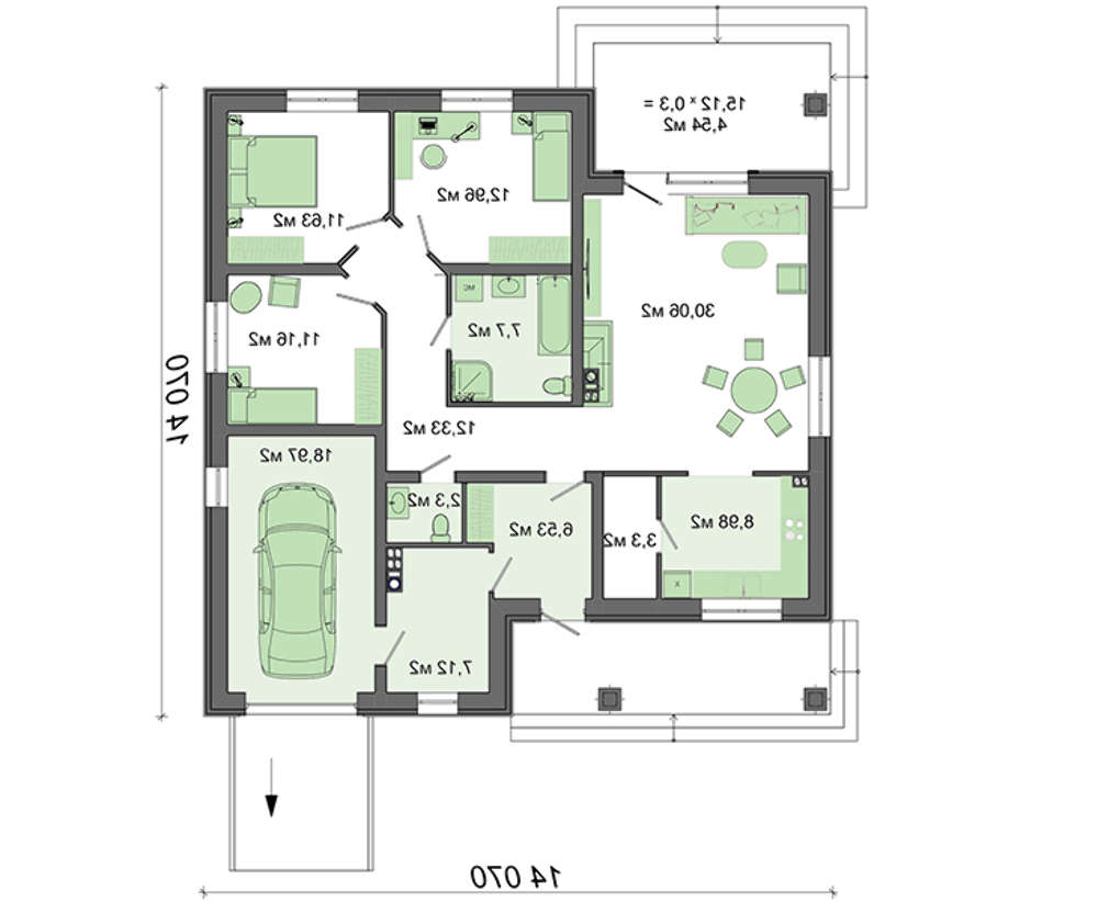 Для того чтобы члены семьи могли одновременно принимать гостей и отдыхать, жилое пространство разделено на блоки. Гаражная часть имеет отдельный вход, что позволяет хозяину покидать дом, не нарушая покоя проживающих. Примыкающее помещение дополнительно можно использовать под мастерскую.