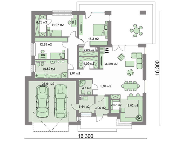 Встроенный гараж рассчитан на два автомобиля, что является большим преимуществом для семьи, ведущей подвижный образ жизни. Рядом расположенное подсобное помещение часто используют для хранения инвентаря и инструмента.