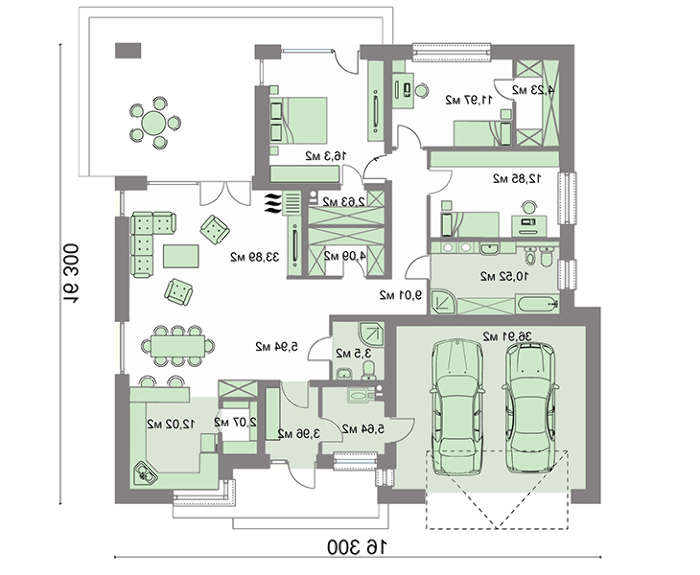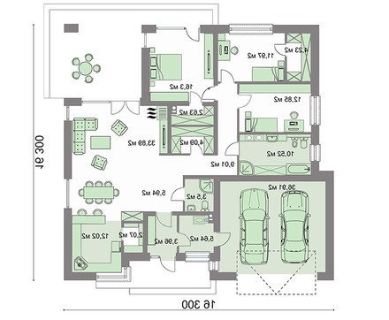 Встроенный гараж рассчитан на два автомобиля, что является большим преимуществом для семьи, ведущей подвижный образ жизни. Рядом расположенное подсобное помещение часто используют для хранения инвентаря и инструмента.