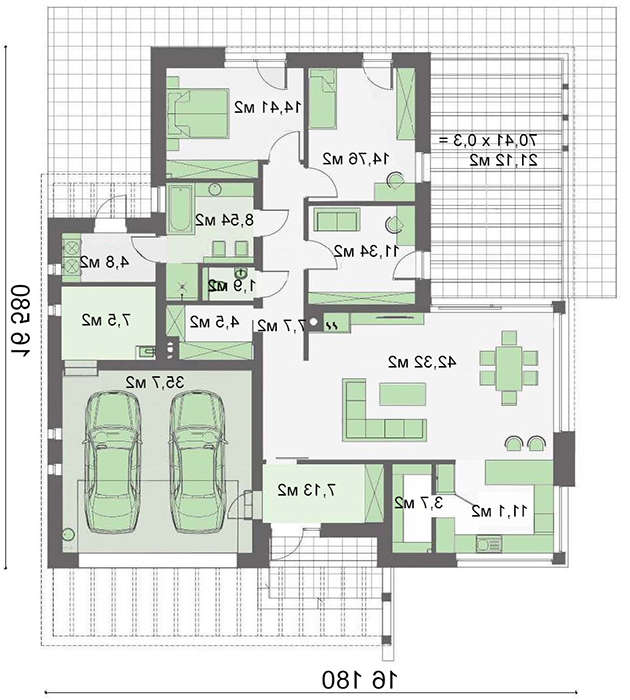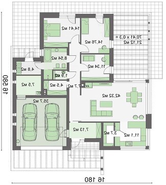 Жилой дом состоит из одного этажа, такую планировку выбирают семьи, которые желают много времени проводить вместе и получают радость от общения друг с другом. В проекте коттеджа зона для отдыха четко отделена от спальной части. Для размещения хозяев и оставшихся на ночь гостей имеет три спальни. Почти одинаковые по размерам, они ставят всех проживающих в одинаковые условия.