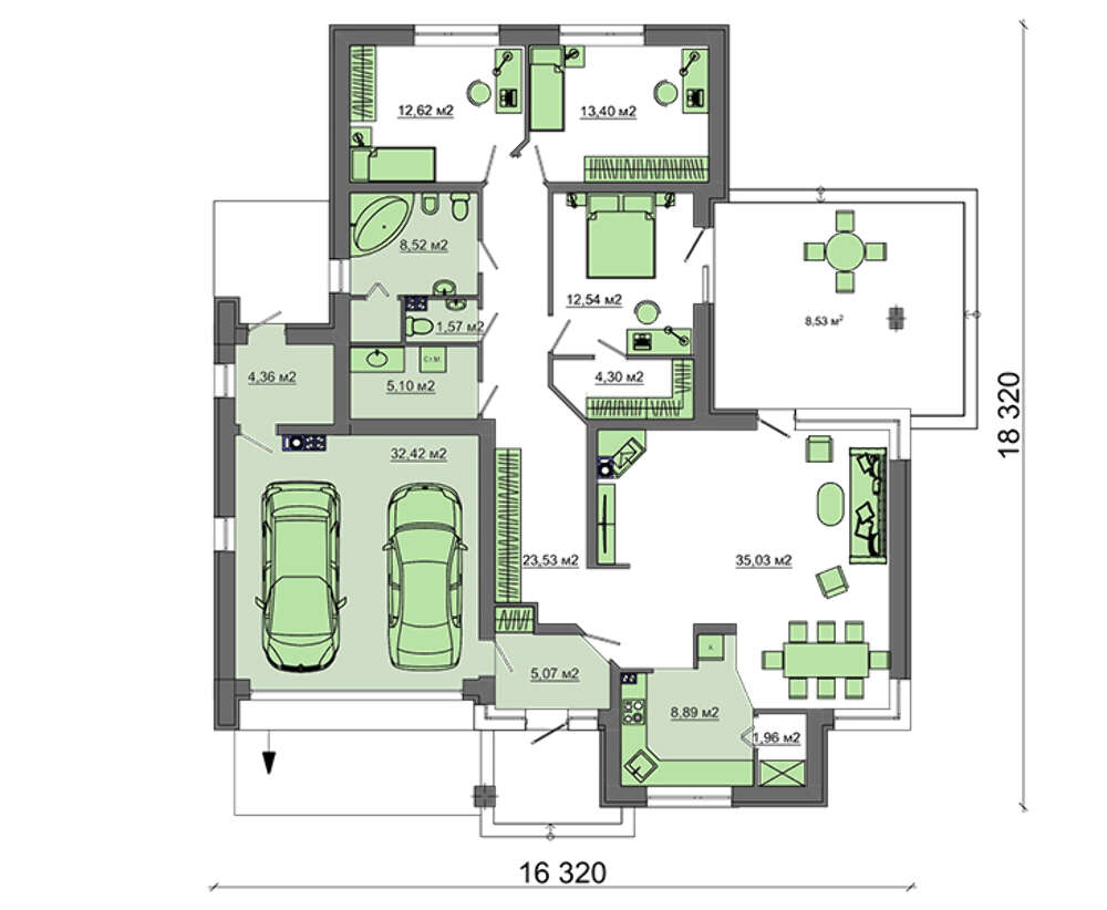 Внутренняя площадь дома разделена на три практически отдельные зоны: техническую, жилую и гостиную. Пространство гаража позволяет хранить две транспортные единицы. Примыкающее помещение выделено на выполнения сервисных работ.