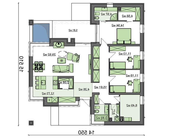 Спальных апартаментов спроектировано три. Наиболее интересно выполнена спальня хозяина. Ее особенность в личном санитарном помещении и отдельном гардеробе, место для которых предусмотрены при планировке.