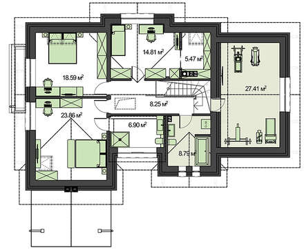 Центральную часть второго этажа занимает холл, из которого предусмотрены входы сразу в три просторные спальни. Хозяйские апартаменты за счет собственного гардероба выглядят особенно удобными.