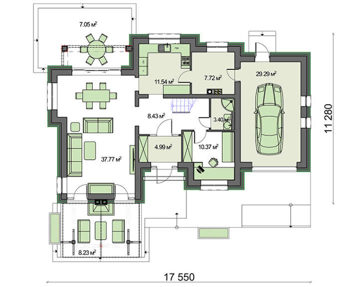 Помещение первого этажа разделена на три блока. Большую часть площади занимают комнаты вспомогательного назначения и кухня. Гаражное помещение позволяет не только хранить автомобиль, но разместить инструменты и оборудование для его обслуживания.