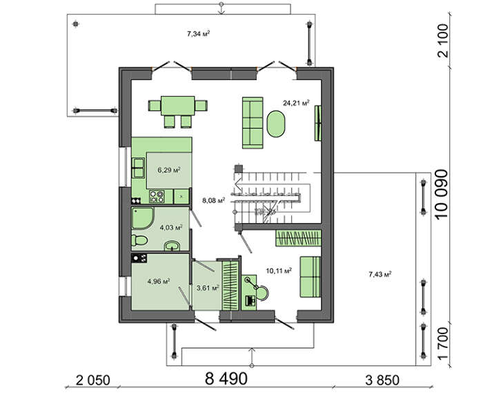 Проект содержит три раздела – АрхитектурныйКонструктивный и Инженерный: водоснабжение, отопление, вентиляция, канализация, электроснабжение (приобретается за дополнительную плату) + Пояснительная записка.