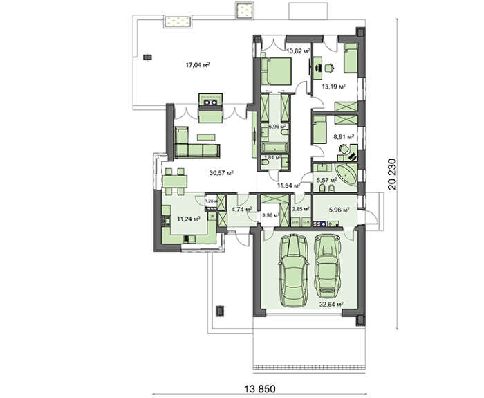 Для того чтобы обеспечь полноценный качественный отдых, пространство этажа разделено на три зоны. Гараж представлен просторным помещением для хранения двух автомобилей и отдельной комнатой, которую можно использовать для проведения сервисных работ и хранения, требуемого в хозяйстве, инструмента.