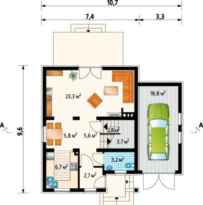 Оригинальный загородный коттедж с маленьким крыльцом и вместительным гаражом