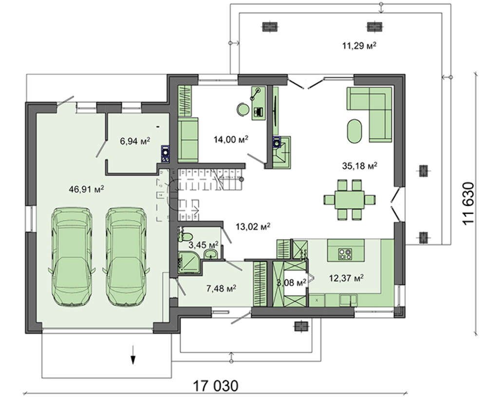 Топочная и гараж вынесены в отдельный блок. На площади почти в 50 квадратов свободно поместятся все транспортные средства семьи. Гостиная объединяет все зоны для отдыха и приготовления пищи. Два выхода на загородный участок позволяют продолжить дружескую встречу или праздничный обед на веранде.