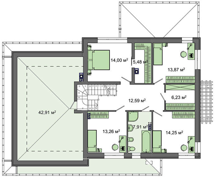 Площадь второго этажа поделена на четыре спальни, санузел и две гардеробные комнаты. Мансардная часть рассчитана на прачечную с сушилкой. Ее размеры позволят оставшееся чердачное пространство использовать на дополнительные цели, такие как тренажерный зал или бильярдную.