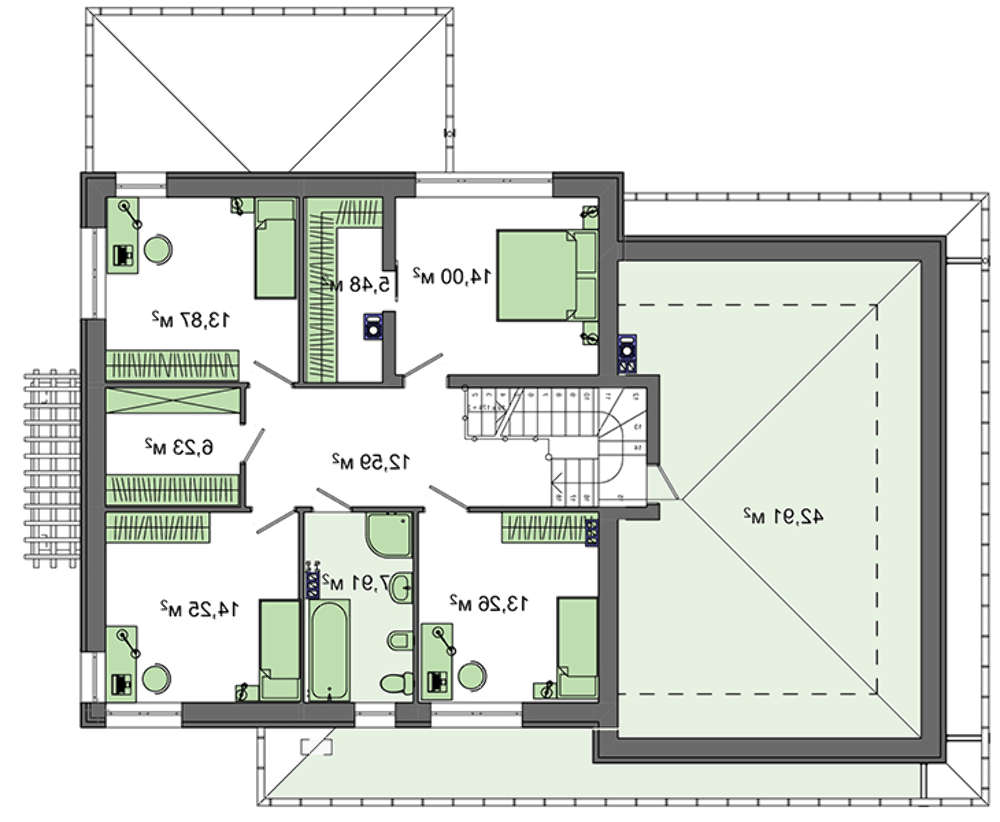 Площадь второго этажа поделена на четыре спальни, санузел и две гардеробные комнаты. Мансардная часть рассчитана на прачечную с сушилкой. Ее размеры позволят оставшееся чердачное пространство использовать на дополнительные цели, такие как тренажерный зал или бильярдную.
