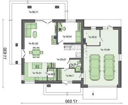 Топочная и гараж вынесены в отдельный блок. На площади почти в 50 квадратов свободно поместятся все транспортные средства семьи. Гостиная объединяет все зоны для отдыха и приготовления пищи. Два выхода на загородный участок позволяют продолжить дружескую встречу или праздничный обед на веранде.