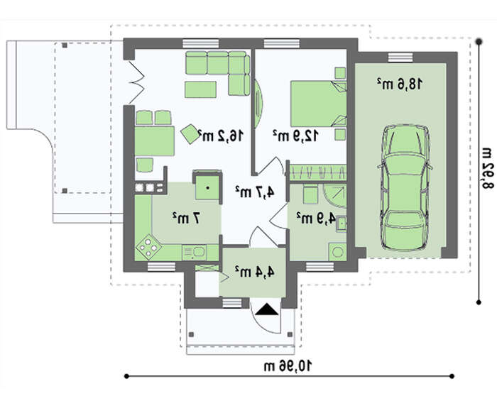 • 4M7136 План дачного домика площадью 68 кв. м с гаражом