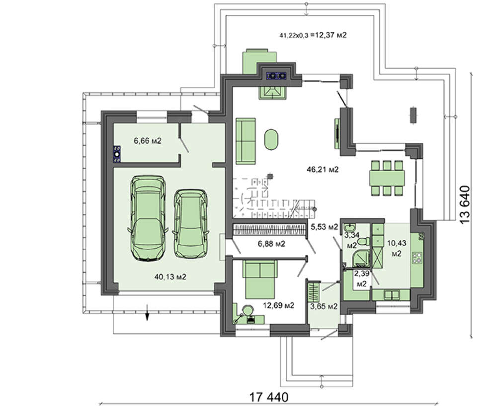 Особенностью первого этажа стал просторный гараж, его пространства достаточно для размещения двух солидных автомобилей. На примыкающей площади в 6 кв. можно организовать мастерскую для ведения слесарных работ и хранить инструмент. Зона отдыха отличается сложной формой, в ее пространстве находятся зоны разного назначения: кухня, гостиная и столовая.