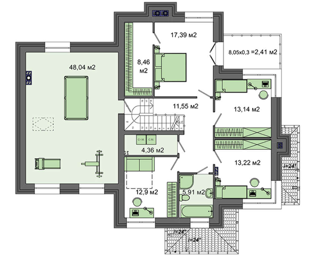 Оставшееся просторное помещение предлагается использовать для размещения спортинвентаря, здесь достаточно места чтобы организовать роскошный спортзал.