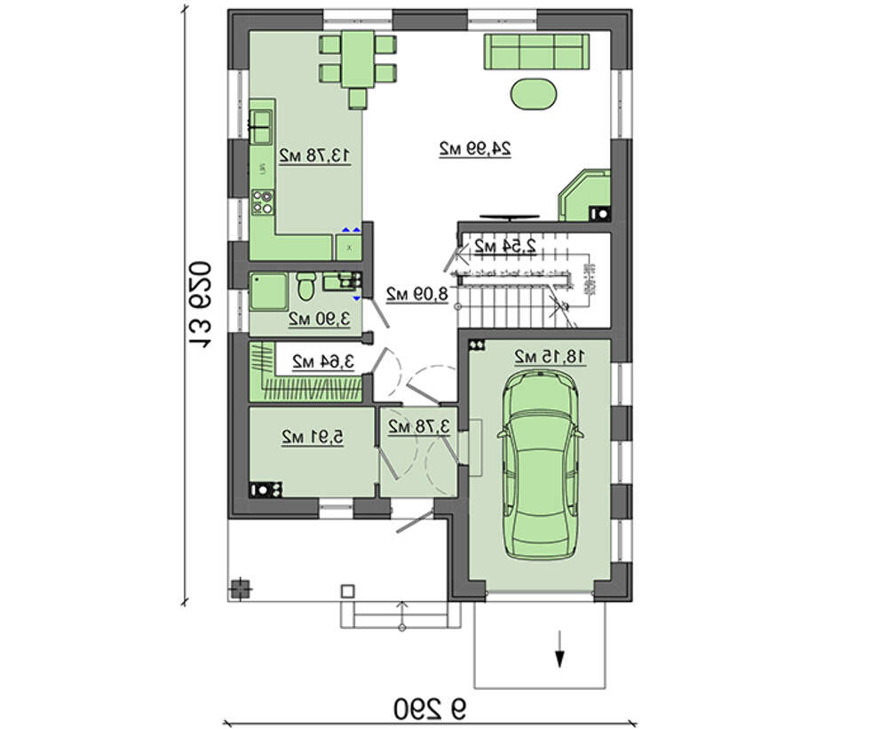 Первый этаж представлен помещениями, которые востребованными только в дневное время. Встроенный гараж решит проблему размещения транспортного средства. Планировка предусматривает объединение гостиной с кухней в единую студию. Полученное пространство разделено только за счет мебели. Обеденный стол отделяет место отдыха от кухни, что позволяет хозяйке одновременно готовить пищу и контролировать все происходящие в комнате события. Для поддержания комфорта на высоком уровне имеется несколько вспомогательных помещений: котельная, холл, прихожая и санузел.