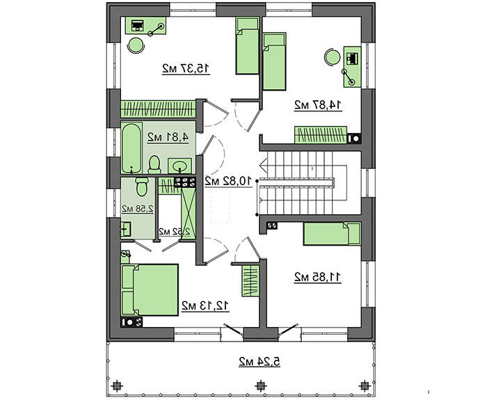 Второй этаж – эти четыре комфортные спальни разного размера и планировки. Особое внимание стоит обратить на самые большие хозяйские апартаменты. Их преимущество в личном санузле и гардеробе. Вносит разнообразие в отдых просторный балкон, выход на который предусмотрен сразу из двух комнат, одна из которых – спальня хозяина. Здесь достаточно места как для отдыха, так и романтического ужина при свечах под звездным небом.