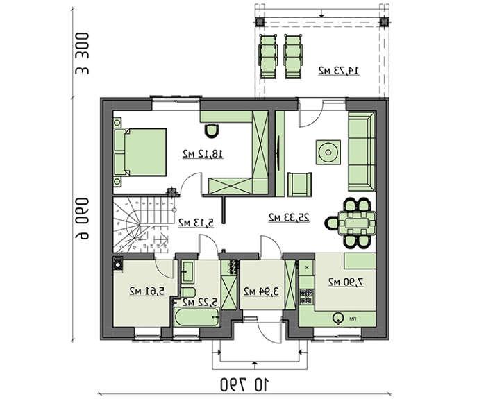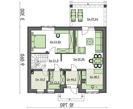 Внутренняя планировка дома полностью соответствует европейскому стилю. Значительную часть первого этажа занимает гостиный зал в 33 кв. м, полученный в результате объединения кухни, столовой и места отдыха. Спальню для гостей можно задействовать как комнату для старшего поколения или использовать как кабинет.