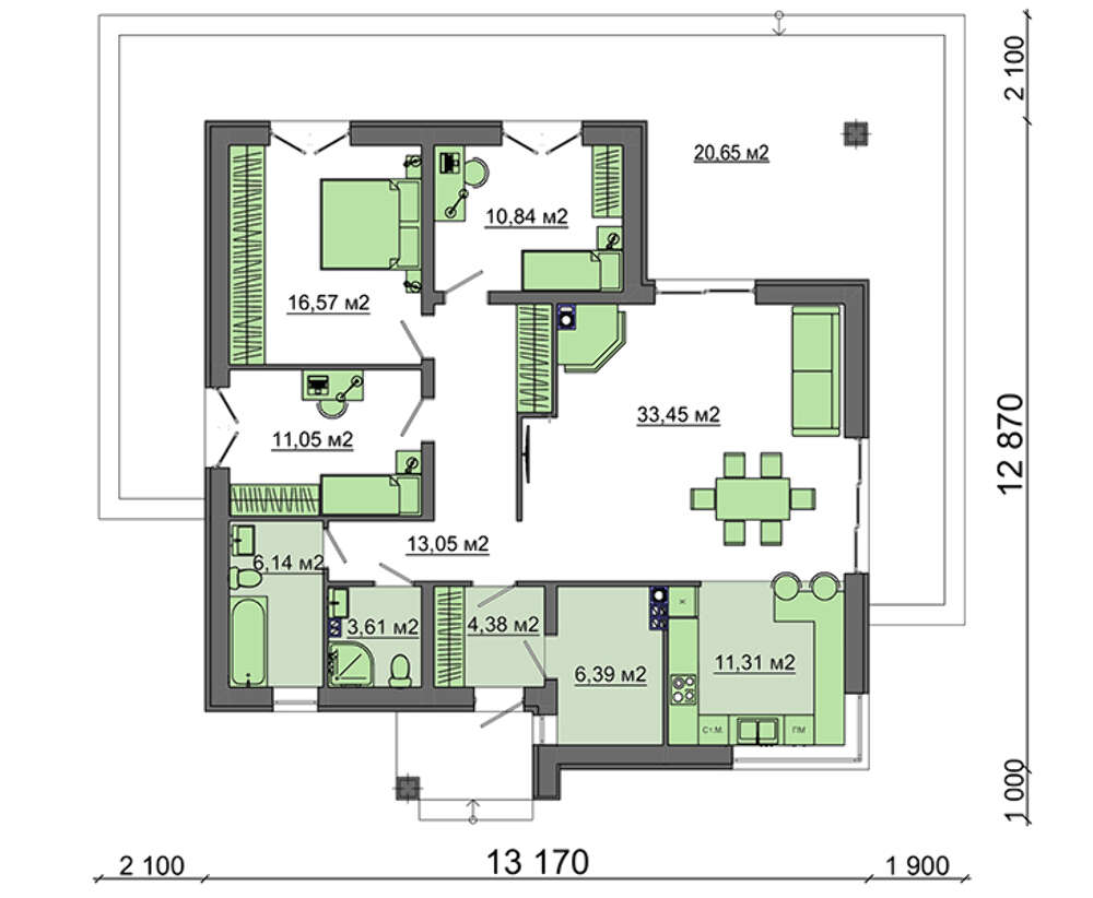 Проект содержит три раздела – АрхитектурныйКонструктивный и Инженерный: водоснабжение, отопление, вентиляция, канализация, электроснабжение (приобретается за дополнительную плату) + Пояснительная записка.