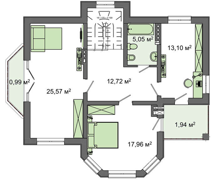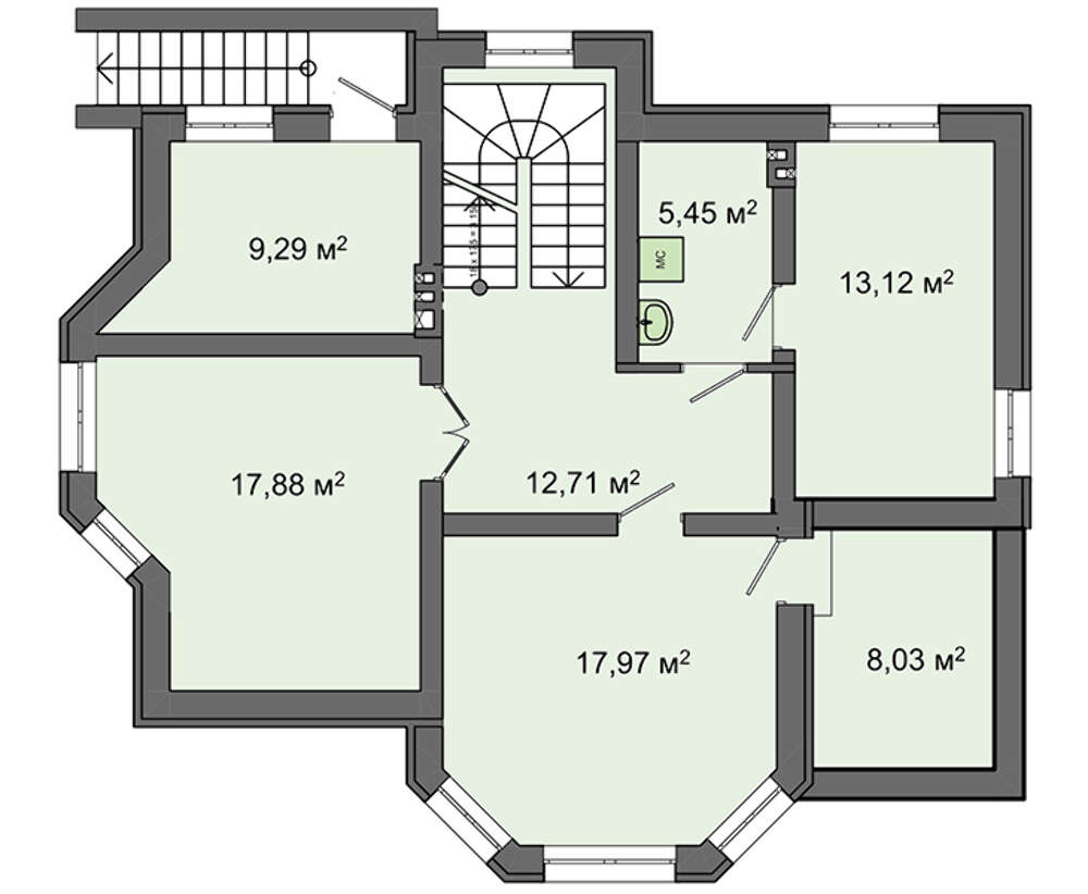 Второй этаж представлен личными апартаментами. Три спальни отличаются не только размерами, но и планировкой. Одно из помещений выигрывает за счет балкона, уникальность второго подчеркнута наличием эркера, жильцам будет трудно выделить лучшее.