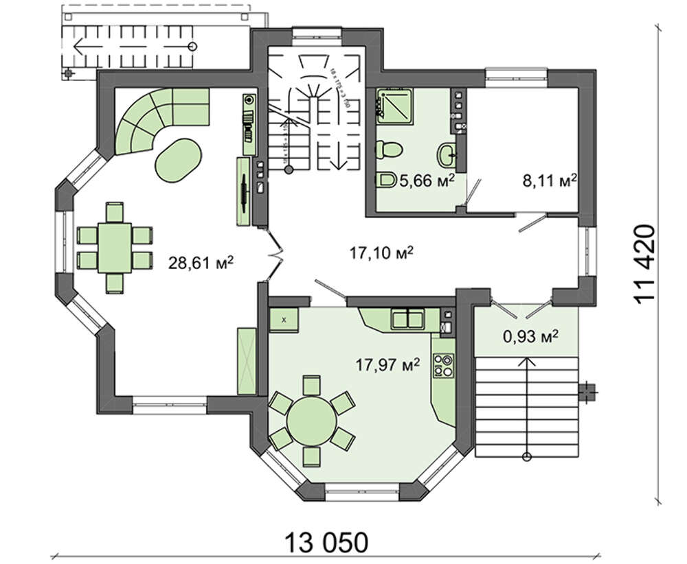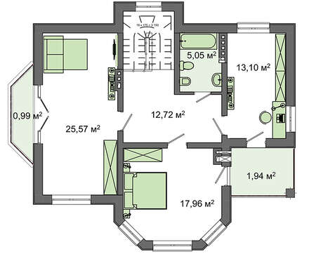 Благодаря наличию эркеров получились помещения уникальной красоты, которые отведены под кухню, гостиную и спальню. Находясь в комнате, жилец получает возможность побыть внутри природы, прикоснуться и насладиться ее красотою. Гостиная соединена со столовой и вынесена в отдельное помещение. Огромные окна наполняют пространство светом и создают ощущение праздника. Уникальная по планировке кухня имеет достаточно места как для приготовления пищи, так и для размещения обеденного стола.