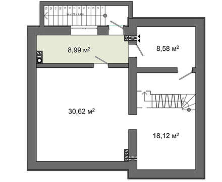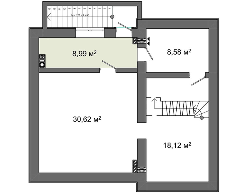 Большую часть оставшейся площади занимает огромный зал в 55 кв. м, соединивший в себе функции гостиной с камином, столовой и кухни. Часть уровня использована для подсобных помещений: прихожей, кладовой, санузла, гардероба и небольшого холла с лестницей, обеспечивающего свободное перемещение и доступ ко всем комнатам.