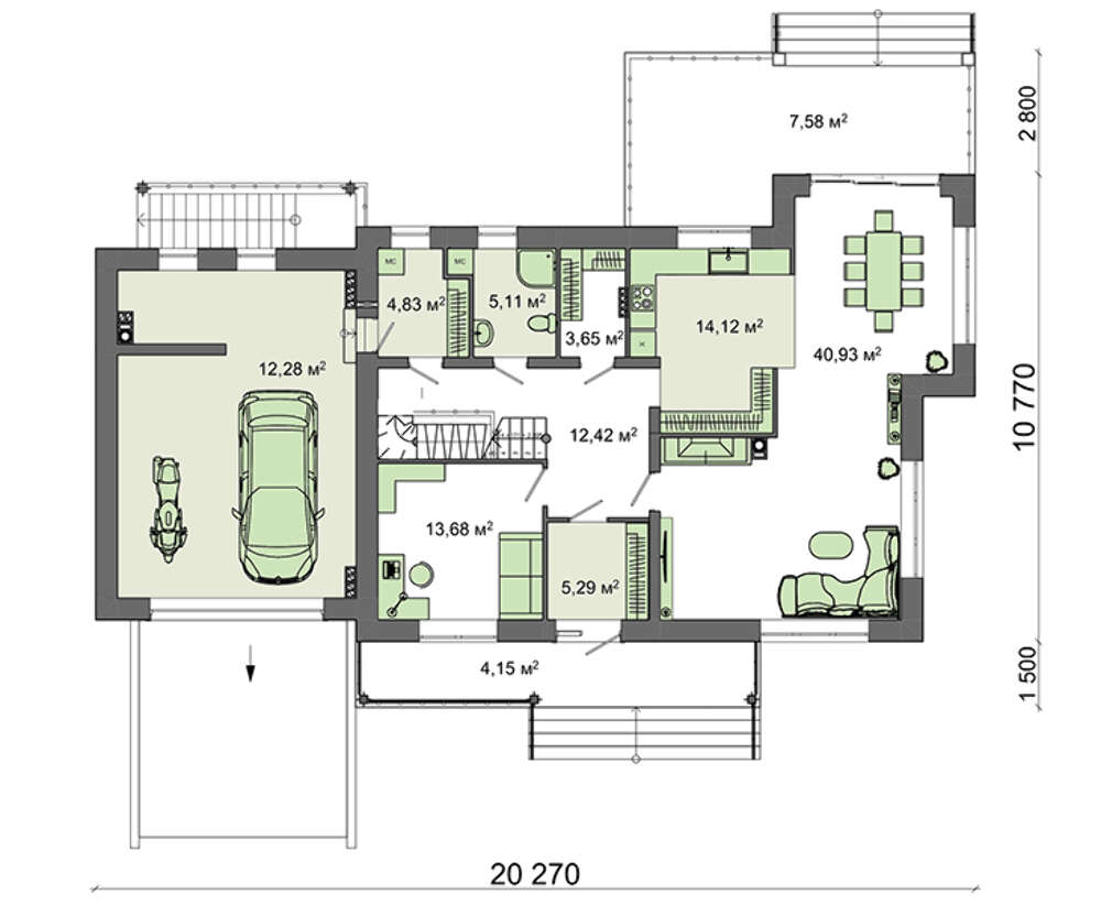 Внутреннее пространство в 284 кв. м грамотно разделено между тремя уровнями коттеджа. Первый этаж относится к зоне дневного времяпрепровождения. К техническому блоку относится просторный гараж для автомобиля, мотоцикла, мастерская и кабинет владельца дома. При необходимости его можно использовать как комнату для отдыха гостей или спальню старшего поколения.