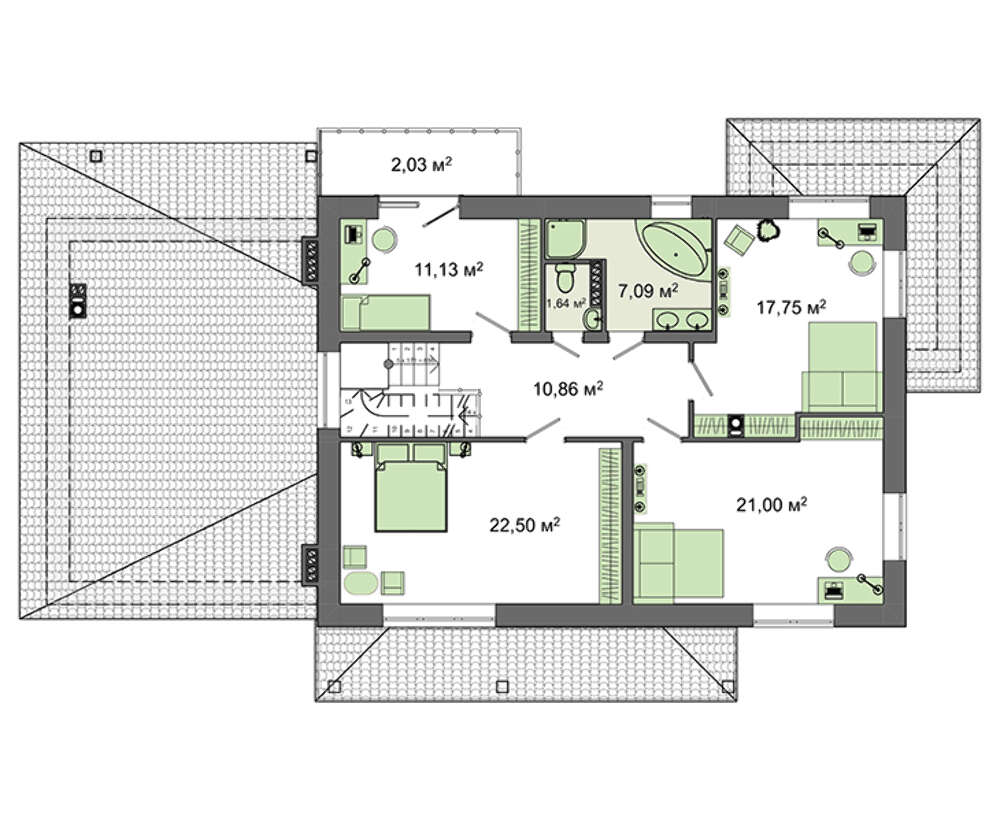 На втором этаже расположены четыре спальни, санузел и коридор, объединяющий все помещения. Цокольный этаж занимает площадь почти в 70 кв. м, она разделена на четыре комнаты разного размера. В одной из них разместилась котельная, остальные могут быть использованы на усмотрение хозяев.