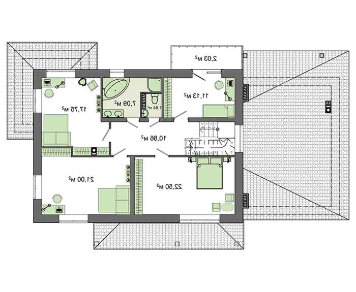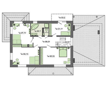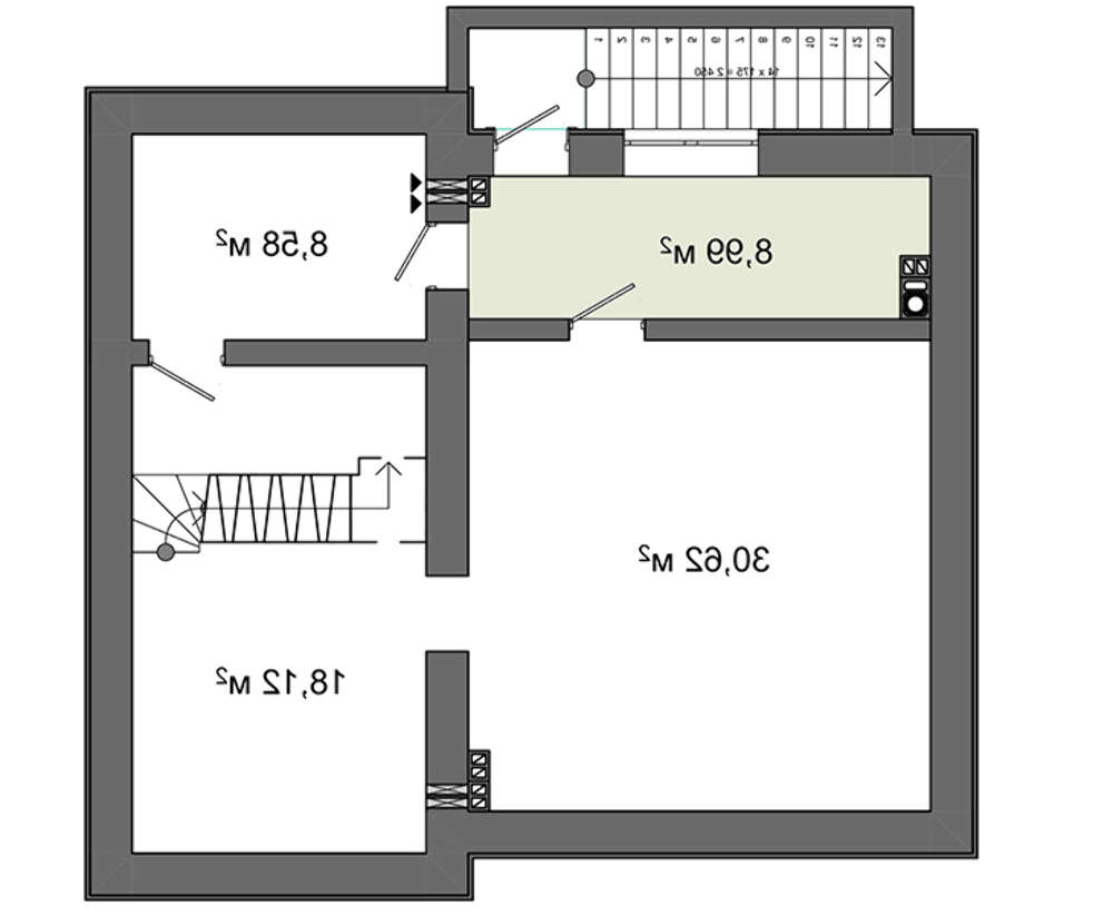 На втором этаже расположены четыре спальни, санузел и коридор, объединяющий все помещения. Цокольный этаж занимает площадь почти в 70 кв. м, она разделена на четыре комнаты разного размера. В одной из них разместилась котельная, остальные могут быть использованы на усмотрение хозяев.