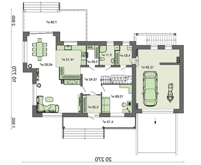 Большую часть оставшейся площади занимает огромный зал в 55 кв. м, соединивший в себе функции гостиной с камином, столовой и кухни. Часть уровня использована для подсобных помещений: прихожей, кладовой, санузла, гардероба и небольшого холла с лестницей, обеспечивающего свободное перемещение и доступ ко всем комнатам.
