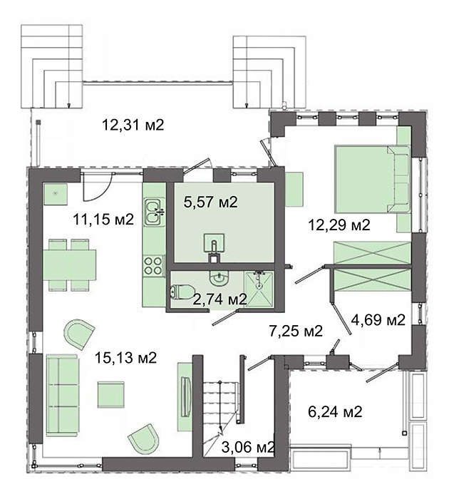 Проект содержит три раздела – Архитектурный, Конструктивный и Инженерный: водоснабжение, отопление, вентиляция, канализация, электроснабжение (приобретается за дополнительную плату) + Пояснительная записка.