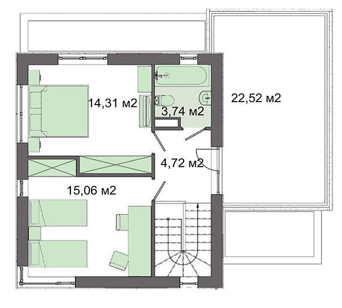 На втором этаже расположен санузел и две личные комнаты примерно одинаковой площади.