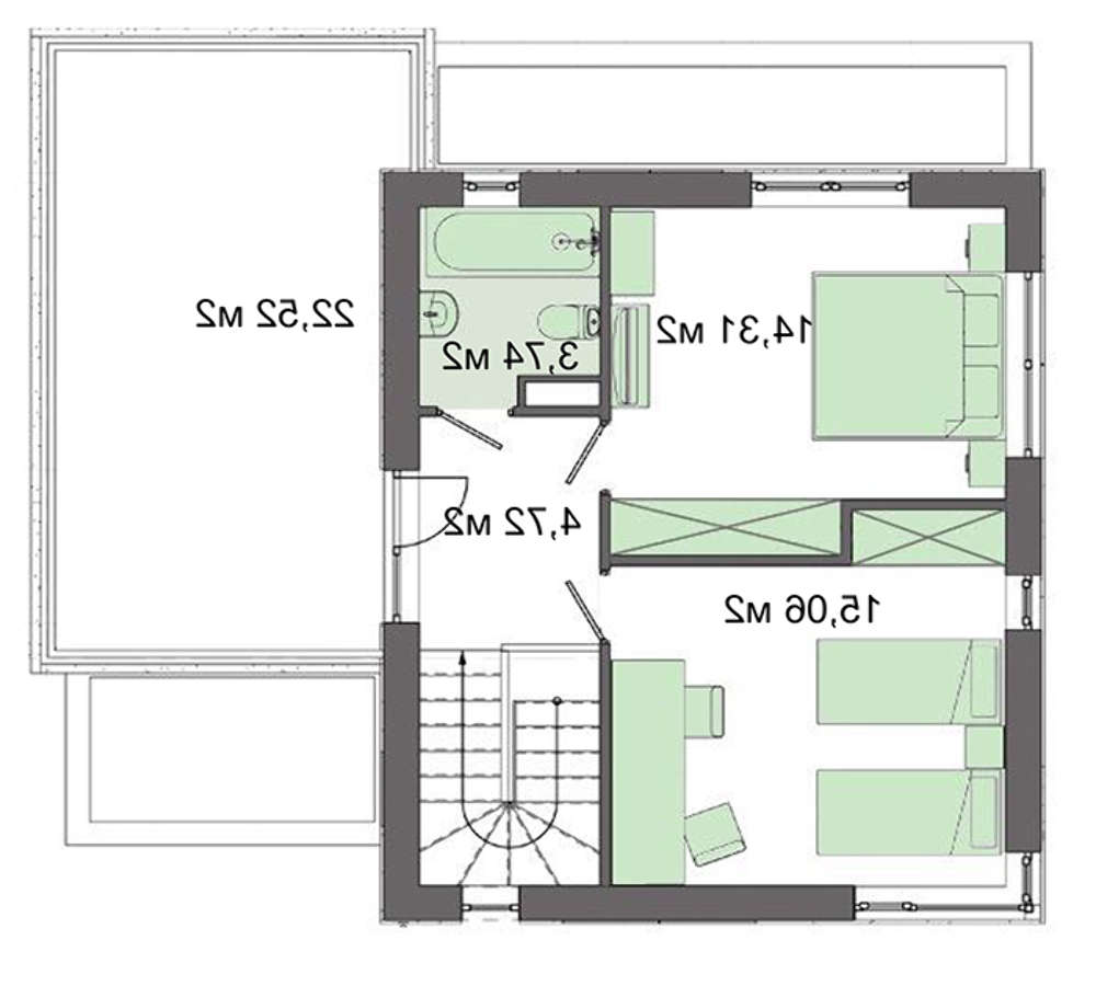 На втором этаже расположен санузел и две личные комнаты примерно одинаковой площади.