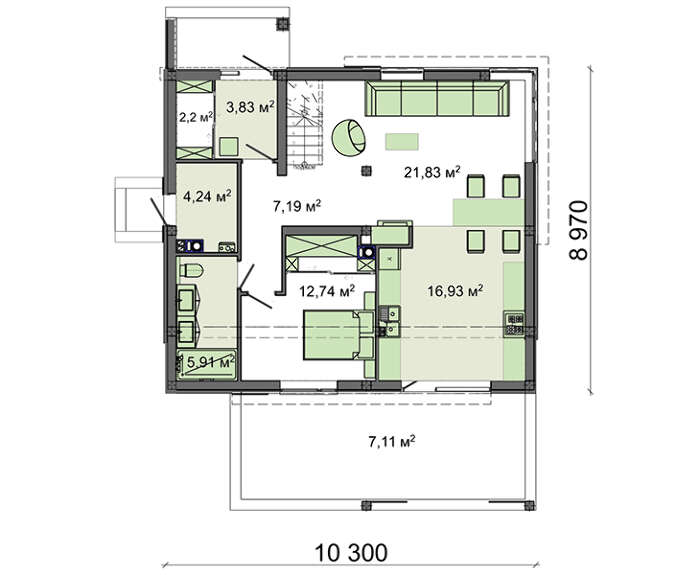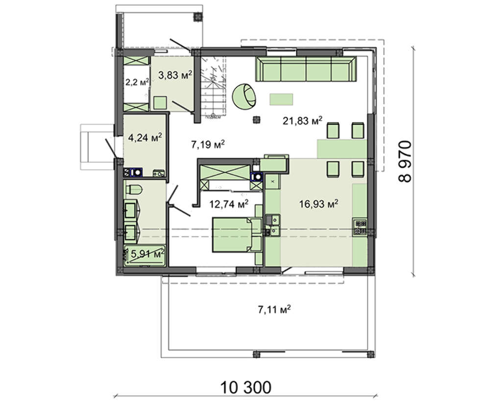 Пространство первого этажа включает комнаты разного назначения. Просторная гостиная примыкает к столовой и кухне, полученное помещение не имеет перегородок, за счет чего достигнуто огромное пространство, наполненное свободой и простором. Отдельная небольшая, но компактная, удобной планировки с нишей, комната может быть использована как личные апартаменты старшего поколения. Площадь позволяет ее переоборудовать под бизнес-кабинет или детскую. Гардеробная первого этажа рассчитана на хранение запасов одежды. Топочная имеет отдельный вход со двора, планировка позволяет ее перепрофилировать под кладовую для хранения сельхоз инструмента.