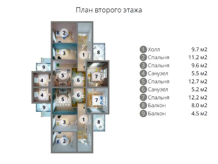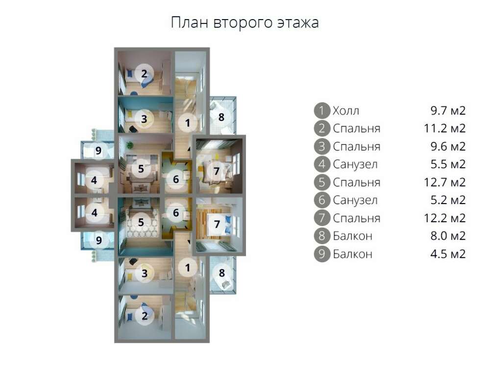Внутреннее пространство разделено на зону дня и ночи. На первом этаже размещены все помещения общего пользования: гостиная для приема друзей и родственников, кухня-столовая для приготовления и употребления пищи, котельная, прихожая и санузел. Для членов семьи старшего поколения предусмотрена комната отдыха. На втором уровне обустроена территория сна. Здесь четыре спальни и две санитарных комнаты. В соседской квартире использована аналогичная планировка, выполненная в зеркальном отображении.