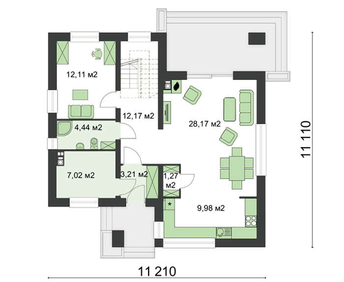 Большую часть дневного временипредполагается проводить на первом этаже жилого дома.Значительныеразмеры у пространства забирает гостиная, которая для увеличения габаритов соединена со столовой и кухней. Для того чтобы приготовление пищи не мешало отдыху, зоны разного назначения максимально удалены. Выход на террасу поможет жильцам больше времени проводить на свежем воздухе. К дополнительным нежилым помещениям первого уровня относится санузел, топочная и гардероб. Изолированная комната рассчитана на меблировку под кабинет. При желании ее назначение может быть заменено на спальню.