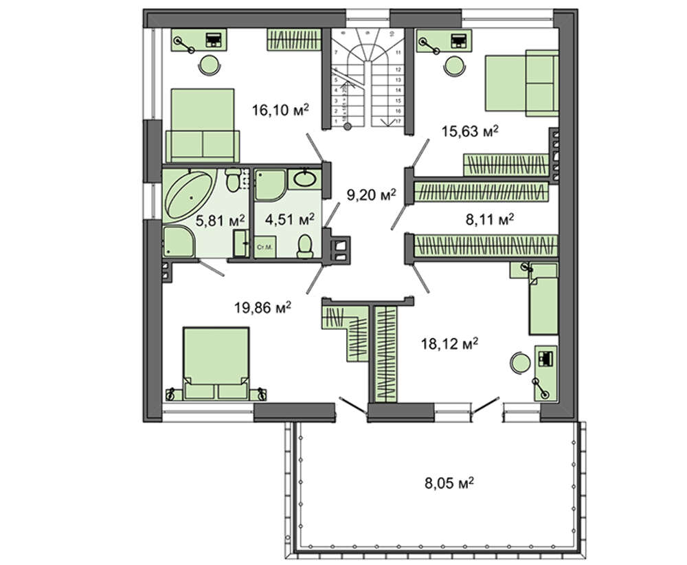 Все спальни находятся на втором этаже. Их четыре, комфортные и квадратные, такая форма позволяет почувствовать простор личных помещений. В каждой комнате достаточно места, чтобы разместить удобную мебель и вместительный гардероб. Наиболее комфортные – это хозяйские апартаменты, их отличие в собственном санитарном помещении. Из двух комнат можно попасть на огромный балкон, он поможет сделать отдых более интересным.