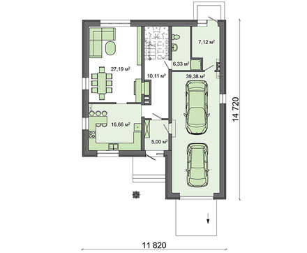 Первый этаж относится к дневной зоне. Просторный гараж – хранилище для двух автомобилей. Есть место и для строительства мастерской, здесь же можно разместить запчасти и инструмент. Гостиная выделена в отдельное помещение, но попасть в нее можно только через столовую и кухню, которые соединены вместе. Все комнаты просторные и наполнены солнечным светом.