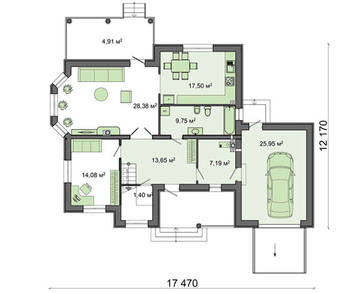 Внутреннее пространство оригинально поделено на комнаты, за счет чего получено множество дополнительных нежилых помещений: холл, кладовая, гардероб. В пространство дома включен гараж на одну машину, он позволит автолюбителю в комфортных условиях обслуживать автомобиль. Помещение топочной можно использовать для хранения инструмента и запчастей.