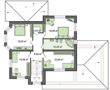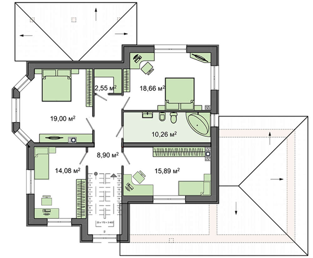 Спальни второго этажа немного отличаются по площади. Особый интерес вызывают личные апартаменты с эркером. Экспериментируя с меблировкой, жильцы имеют возможность получать отличные дизайнерские решения.
