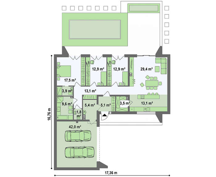 • 4M6391 Планировка современного коттеджа площадью 170 кв. м с тремя спальнями и санузлами