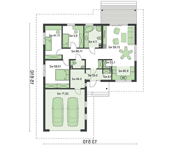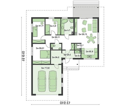Проект компактного коттеджа площадью 120 кв. м станет удачным приобретением для семьи, поменявшей шумный мегаполис на тишину загорода. Он может быть использован как постоянное жилье, так и в качестве сезонного отдыха на дачном участке. Одноуровневый дом требует меньших затрат при строительстве, а наличие просторного гаража на два автомобиля легко решает проблему трансфера на службу или учебу. Коттедж рассчитан на комфортное проживание среднестатистической семьи.