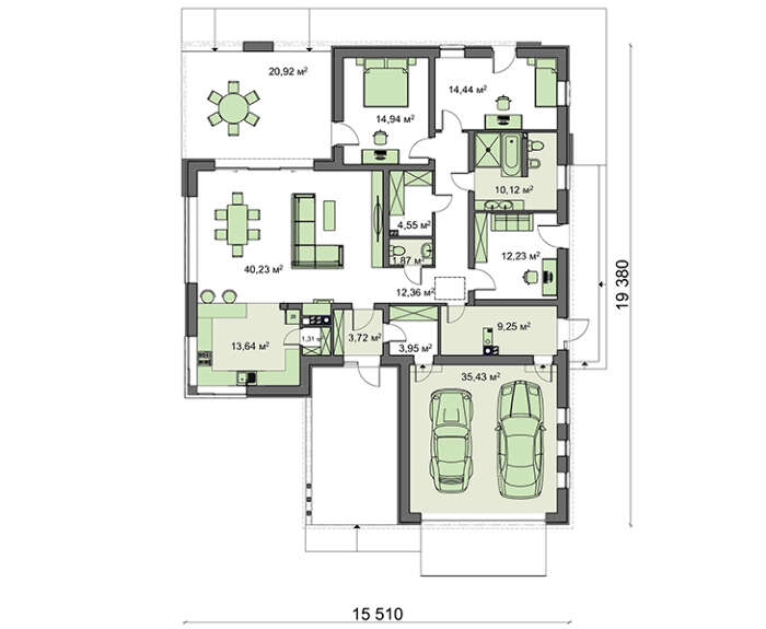 Просторный гараж площадью более 35 м2 позволяет разместить два транспортных средства. Рядом расположенное помещение по замыслу архитектора, можно использовать как мастерскую. Планировкой предусмотрено достаточное количество гардеробных комнат и кладовок, чтобы упрятать съестные припасы, бытовую технику и инвентарь.
