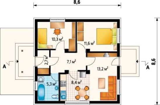 Благодаря рациональному разделению внутреннего пространства найдено место для двух индивидуальных помещений, санитарной комнаты и зоны коллективного проведения времени. Столовая, кухня и гостиная слиты вместе. Планировка позволит встречу перенести на наружную территорию, для этого предусмотрен выход на террасу, дающий право непосредственно из зоны дружеских приемов покидать комнату. Если на приусадебном участке и террасе расставить садовую мебель, то именно здесь получится приготовить отличные шашлыки, выпитый чай будет особенно ароматным, отдых насыщенным и полноценным, приобретен новые оттенки.