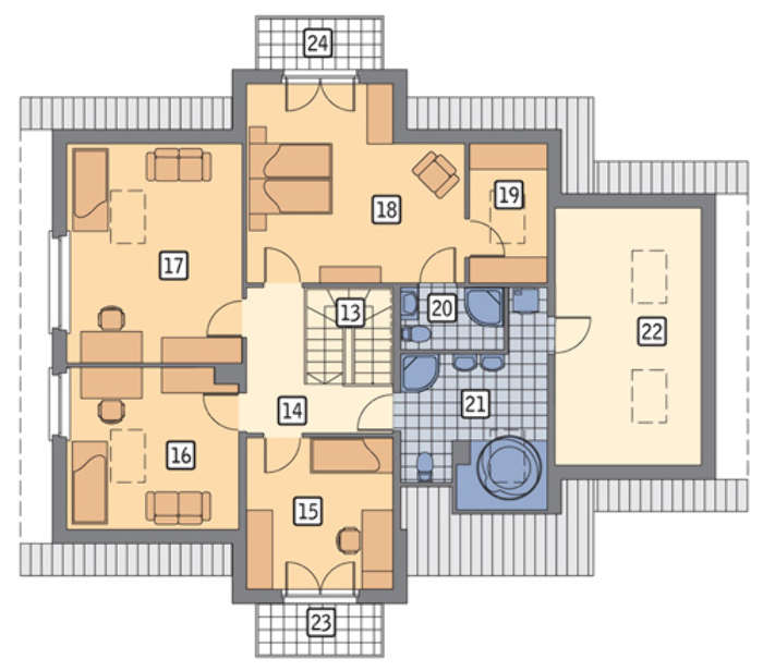 На верхнем уровне находится территория ночи. Она включает три спальни разной площади и степени комфортности и апартаменты владельца коттеджа с собственным балконом, гардеробом и санузлом. На этаже также имеется ванная комната общего пользования. Помещение над пристроенным гаражом можно превратить в спортзал для занятий бодибилдингом.
