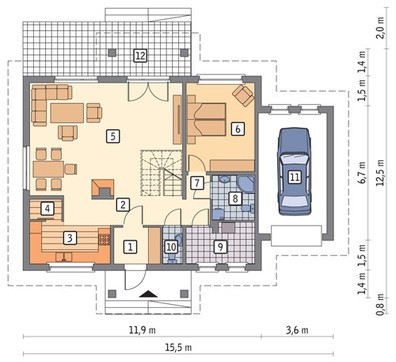 Внутренняя планировка дома разработана с присущей европейцам практичностью и рационализмом.  На первом этаже путем объединения гостиной, столовой и кухни получен просторный зал. В его центре установлен настоящий камин. Комната отдыха для гостей, может быть переоборудована под спальню для человека с ограниченными возможностями или личный кабинет. На этаже имеется раздельный санузел и котельная, дополнительно используемая в качестве бытовой комнаты. В примыкающей пристройке расположился гараж для автомобиля.