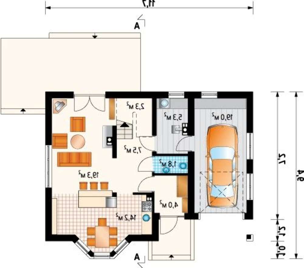 В пространстве первого этажа присутствуют комнаты разного назначения. Выделено достаточно площади для гаражного помещения. Гостиная часть строения оборудована своим выходом на наружное пространство. Такая планировка создает дополнительные удобства как для хозяев, так и для их друзей, позволяя легко переносить отдых на загородный простор.