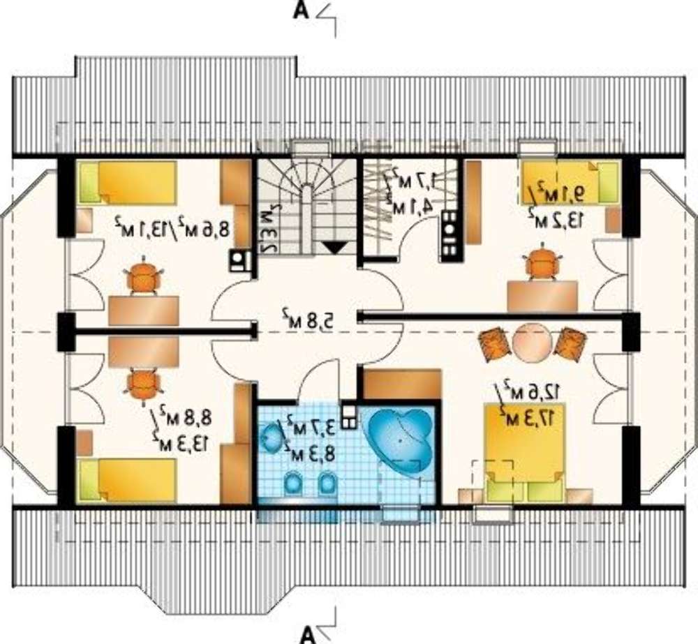 Привлекательный проект мансардного коттеджа рассчитан на комфортное проживание большой семьи. Для личного времени и отдыха имеется четыре помещения второго этажа. Компактные комнаты рассчитаны на размещение потребного мебельного гарнитура. Особо комфортными и удобными помещение делают балконы, выходы на которые имеются во всех спальнях. Для любителей множества вещичек предусмотрена комната с обширным гардеробом.