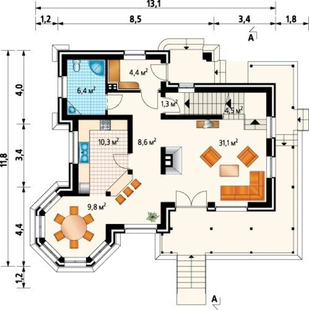 Все жилое пространство первого этажа отдано под места дружеских приемов, поражает уникальной планировкой и наличием простора. Столовая отнесена в район круглого эркера, такое размещение позволяет завтраки и обеды проводить внутри природы, любуясь восхитительной живописной растительностью сквозь большие оконные проемы. Необычная по форме кухня стала центом помещения, при этом не загромождая его кухонной мебелью, бытовой техникой и специфическими запахами. Истинная средина пространства отдана под очаг — работающий камин с живым огнем. Его тепло будет согревать тела и души жильцов и их друзей, радуя воспоминаниями в далеких странах и маня в моменты отсутствия.