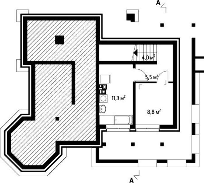 Особенность здания в цокольном этаже. Его большая площадь может быть применена для комнат разного целевого назначения. Здесь легко отыскать место под складское помещение, зал тренажеров, сауну. Вариантов использования пространства бесконечно много.