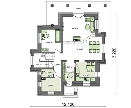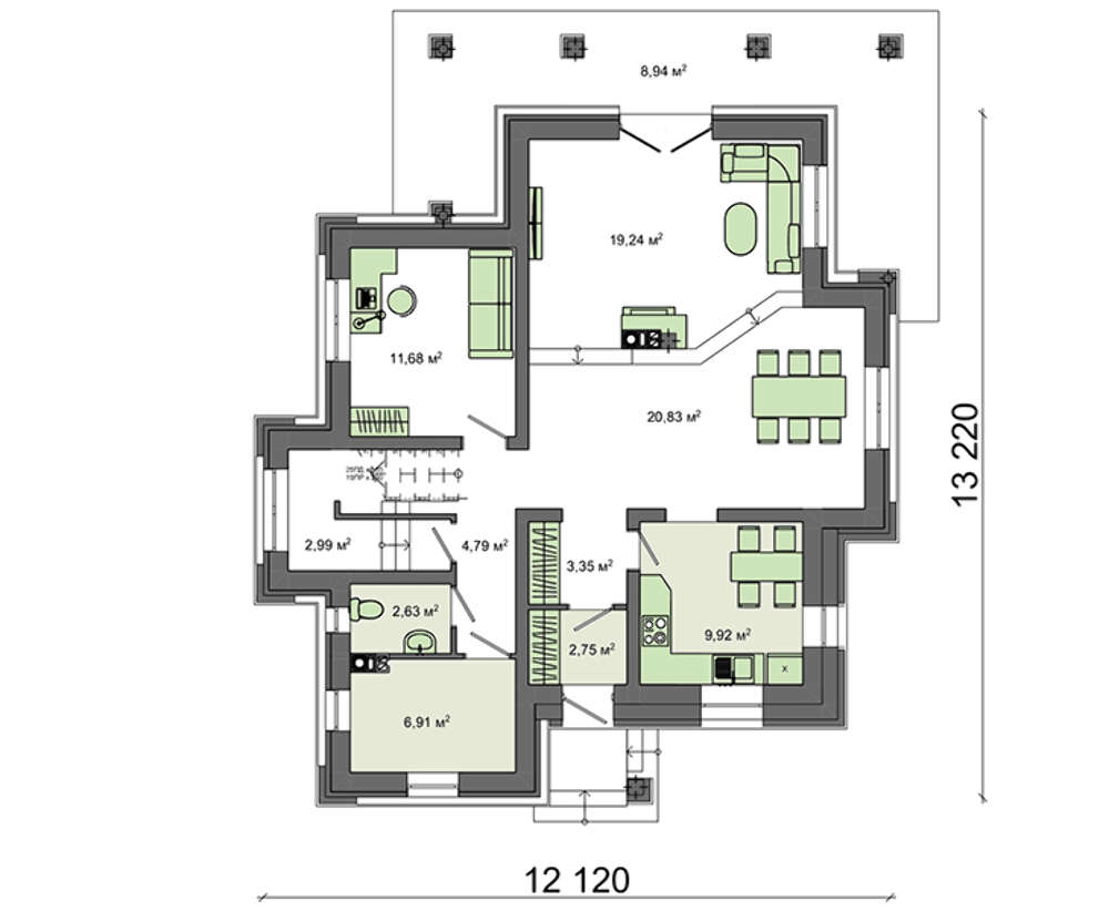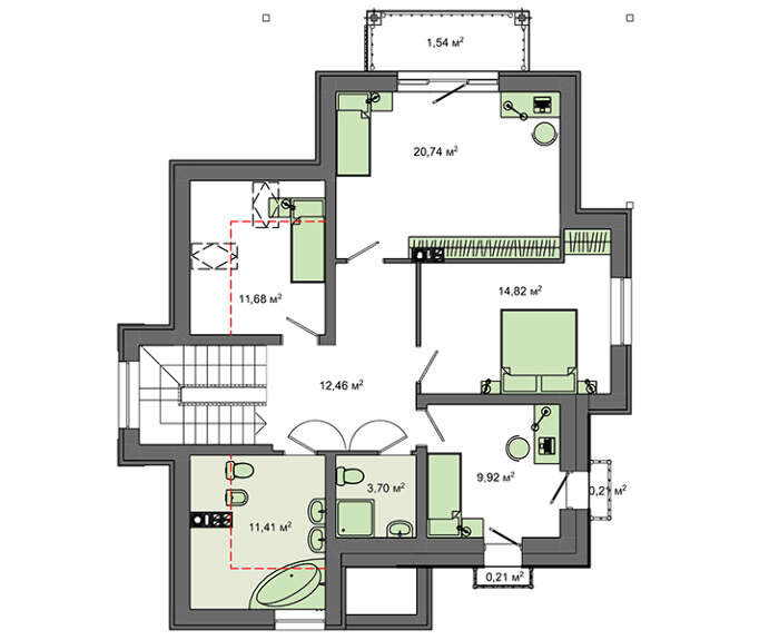 Внутренняя планировка, как присуще романскому стилю, напрочь лишена симметрии. Все положено на алтарь основательности и практичности. В планировочных решениях наблюдается некая величественность. Помещения большие и просторные. Гостиный зал на первом этаже за счет объединения зоны отдыха, столовой и кухни собрал площадь более 50 кв. м.